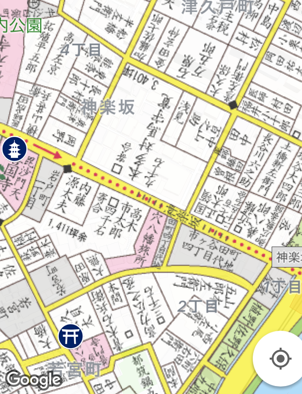 神楽坂といえば「花街」が思い浮かぶ。善国寺が麹町から移ってきた寛政期に周辺に茶屋ができ岡場所として賑わったのを引き継いで花街を形成したという。ピーク大正時代から昭和初期には芸者が700人ほどいたという。